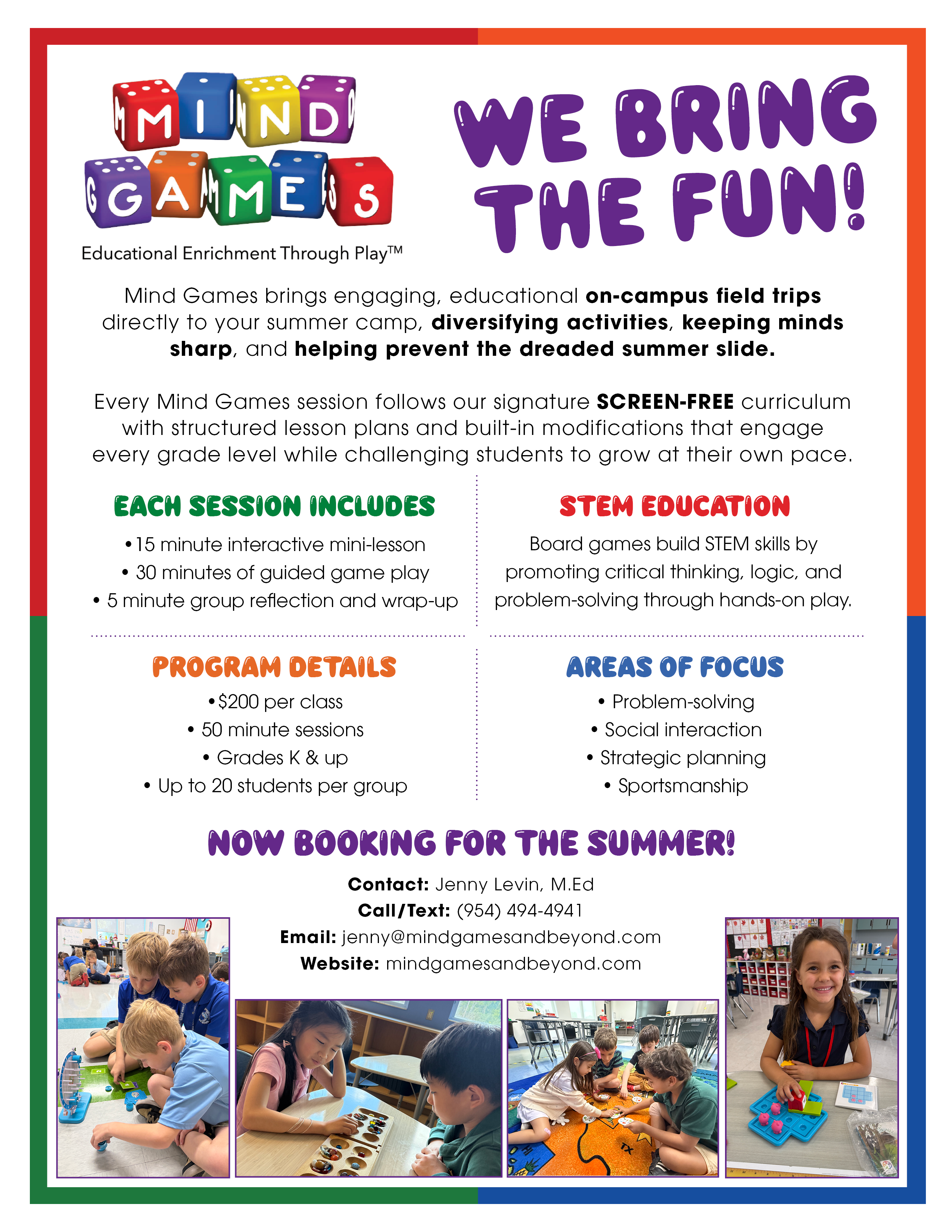 Welcome to Mind Games! Mind Games is a fun and challenging way for students to increase academic achievement while working cooperatively towards common goals. Our mission is to help students improve their grades by expanding their cognitive abilities and to assist them in developing important life skills that will lead to a lifetime of successes. Mind Games will also create an environment that will help improve students' self-esteem, self-worth and self-confidence as well as provide a setting to develop interpersonal skills such as communication, cooperation, teamwork and leadership. Curriculum Mind Games brings the top educational S.T.E.M. (Science, Technology, Engineering, and Math) based games to the classroom. S.T.E.M. education is a great launching pad for curiosity, investigation, critical thinking, teamwork, and problem solving. Each week students play screen-free board games that stimulate brain development, delight their senses and produce meaningful learning moments! Sessions begin and end with discussions about strategy, cooperation, competition, good sportsmanship, finding solutions and teamwork. Skills Our curriculum covers a wide range of academic and social skills including: